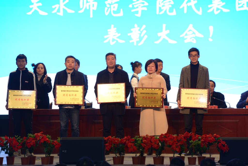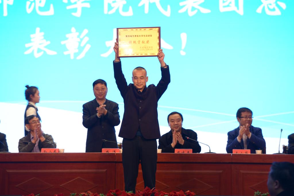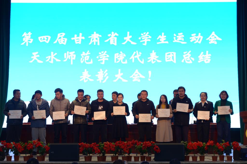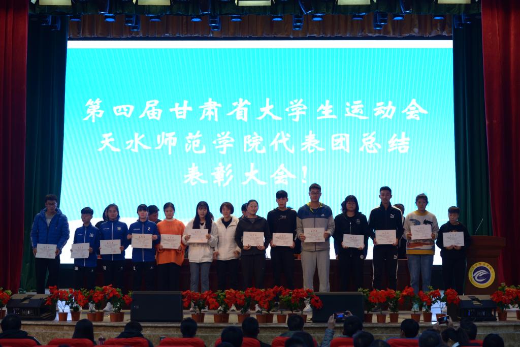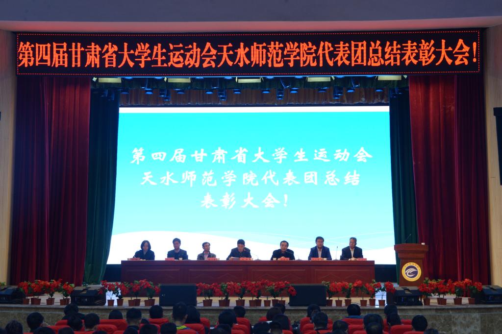 10月14日下午,第四届甘肃省大学生运动会天水师范学院代表团总结表彰大会在学校文化大礼堂召开。学校党委副书记、校长安涛出席会议并为受到表彰的单位和个人进行颁奖。校工会、学生处、团委、二级学院相关负责人,体育运动与健康学院全体师生和代表团全体运动员、教练员、工作人员共计800余人参加大会。大会由副校长、校体委主任安建平主持。