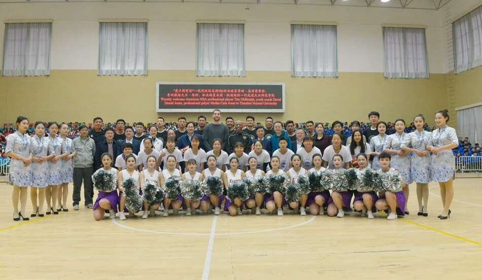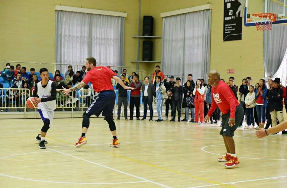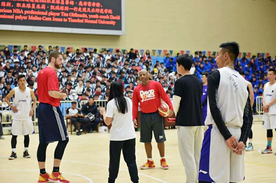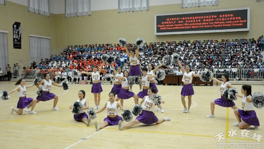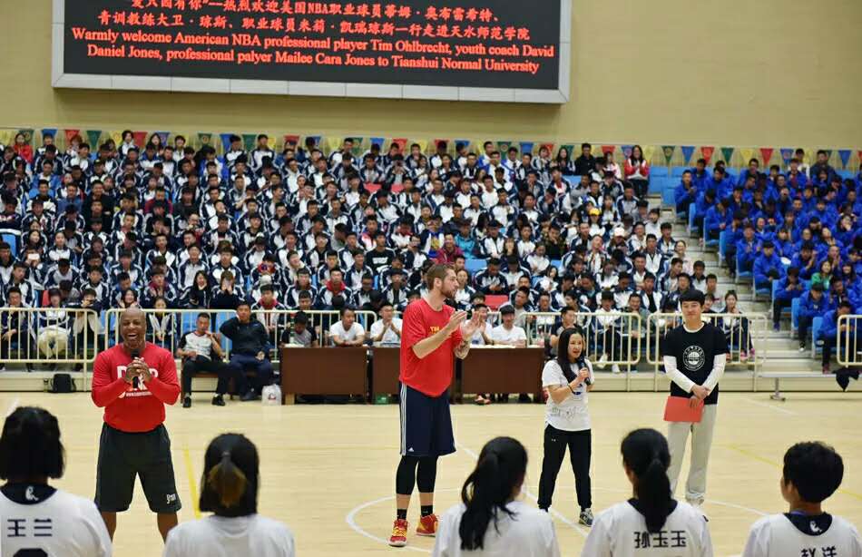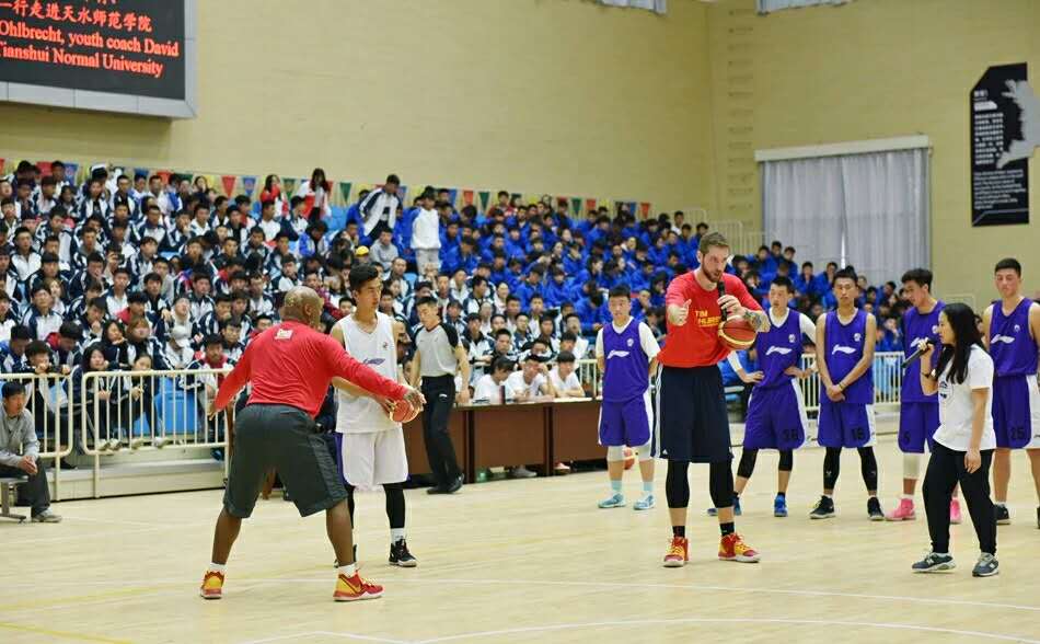 随后,在啦啦操的表演中拉开了今天篮球教学比赛观摩及演练交流活动的序幕,在蒂姆·奥布雷希特、大卫·琼斯的现场观看、指导下,天水师范学院女子篮球队、男子篮球队进行了表演比赛,比赛异常激烈。紧接着迎来了比赛的高潮部分,美国嘉宾蒂姆·奥布雷希特、大卫·琼斯分别加入到学生的两支男子球队中,与我校男子篮球队队员同框为现场的观众带来了一次精彩的NBA视觉盛宴,尤其是球员蒂姆·奥布雷希特的扣篮动作赢来了一次又一次的欢呼声。精彩的比赛过后,邀请三位美方嘉宾给球员们教练进行技术辅导,现场指导篮球队员投篮动作,临场教学,再一次拉近了与球员们的距离,增进了友谊,队员们认真聆听嘉宾们的指导,脸上洋溢着溢于言表的愉悦。三位美方嘉宾为篮球队员进行防守及进攻动作指导,最后优秀队员与球星二对二实战交流演练。