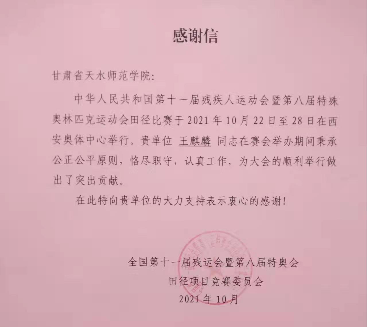 2021年10月22-28日,中华人民共和国第十一届残疾人运动会暨第八届特殊奥林匹克运动会田径比赛在西安奥体中心举行。best365官网特奥田径国家级裁判王麒麟教授受中残联和国家体育总局选派为田径项目技术官员,并担任田赛裁判长。