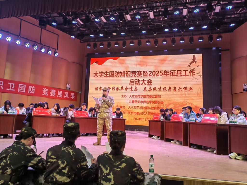 2024年12月5日,天水师范学院大学生国防知识竞赛活动在音乐厅举行。体育运动与健康学院积极响应,经过严格选拔,推荐了三名优秀学生代表学院参加竞赛。本次竞赛分为速记、识图、抢答三个环节,共有全校18个二级学院的54名参赛选手参与角逐,竞争异常激烈。