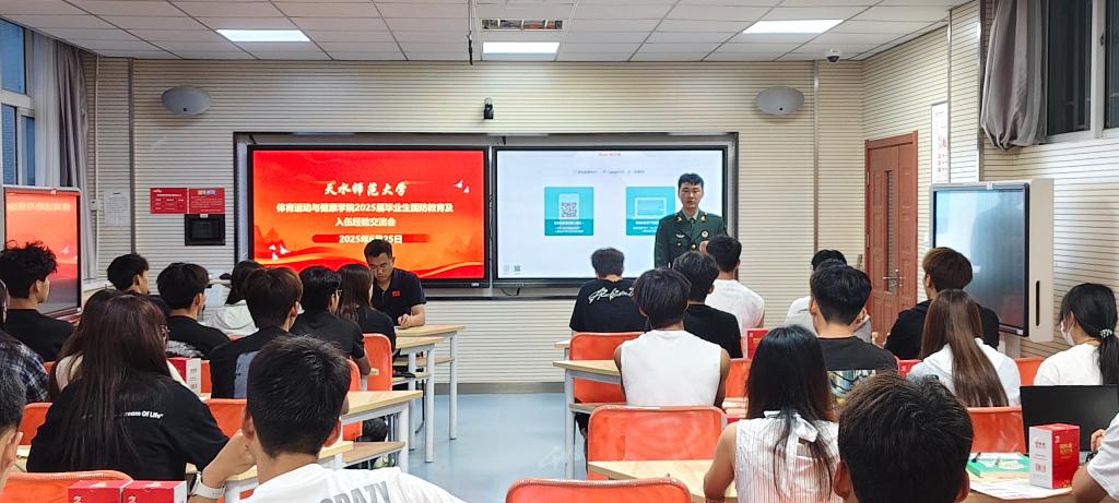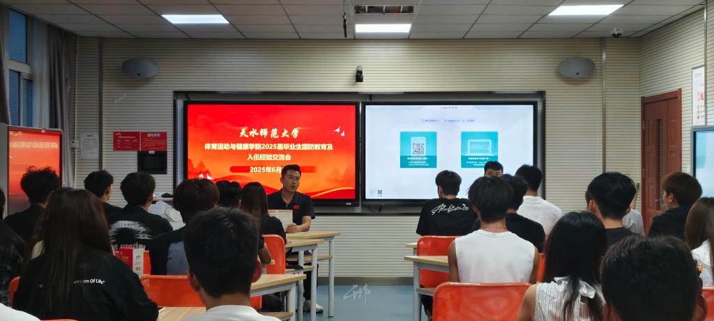 2025年6月25日,体育运动与健康学院在2号教学楼323智慧教室举行2025届毕业生国防教育及在校学生应征入伍交流会。此次活动由学院辅导员、退伍复学学生代表、在校学生代表共40余人参与。会上,学院精心为每位参会毕业生发放了纪念品,这份纪念品不仅是对毕业生的关怀,更承载着对他们投身国防事业的期许,激励着他们积极响应国家号召,投身国防建设,书写热血青春。