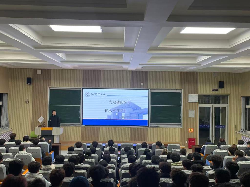 12月9日晚6:30,体育运动与健康学院2025级全体学生在二教122阶梯教室齐聚一堂,召开以“一二·九运动纪念日:传承爱国精神”为主题的年级会议。会议由学院辅导员主持,210名学生全员参与,现场气氛庄重而热烈。