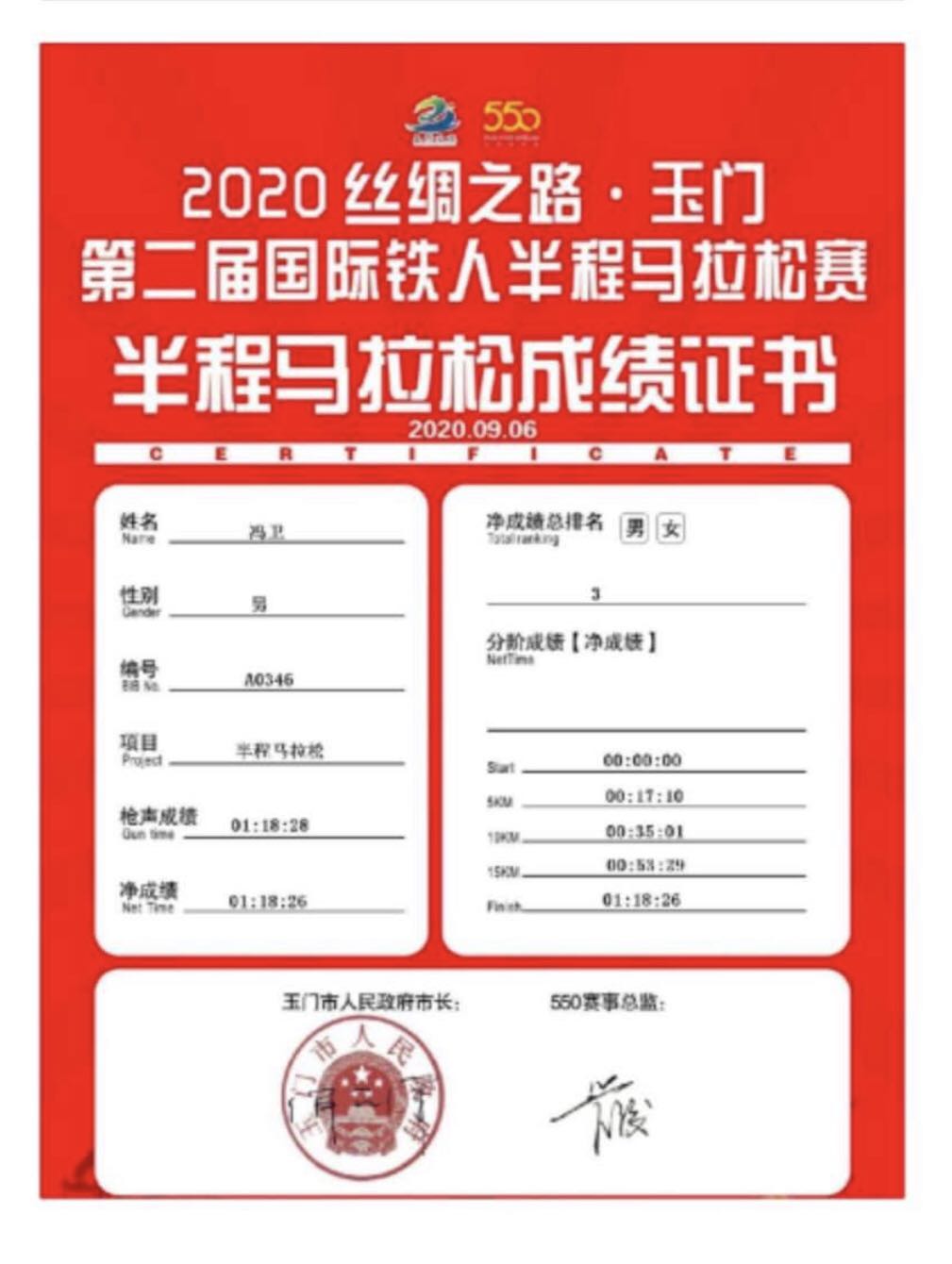 由甘肃省体育局、玉门市人民政府主办,玉门市文体广电和旅游局、玉门市体育中心、玉门市委直属机关工委承办,戈友文化传媒(上海)有限公司运营的2020丝绸之路.玉门第二届国际铁人半程马拉松赛于9月6日在玉门市政广场鸣枪开赛,有来自全国19个省份,60多个城市,共计5000名专业马拉松选手参加本次比赛,best365官网运动训练专业2018级冯卫同学,在比赛中不畏强手,最终以1小时18分26秒获得男子组第三名的好成绩,为我校争得了荣誉!