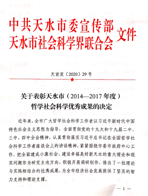 近日,经天水市委宣传部《关于表彰天水市(2014-2017年度)哲学社会科学优秀成果的决定》【2020】29号文件公布,best365官网程晖、秦婕、王怀虎、段文义、陈玮等教师喜获优秀成果奖。