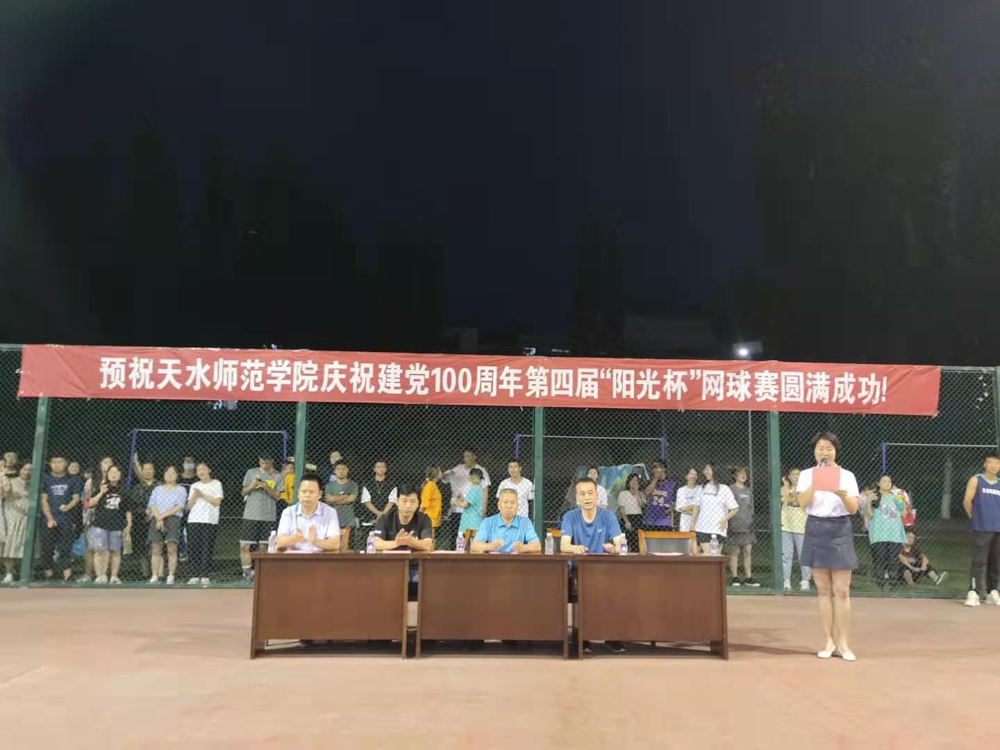 2021年6月29日晚,天水师范学院庆祝建党100周年暨第四届“阳光杯”网球赛圆满落幕。闭幕式现场进行了文体节目表演及颁奖仪式,体育运动与健康学院的领导为获奖选手颁奖。