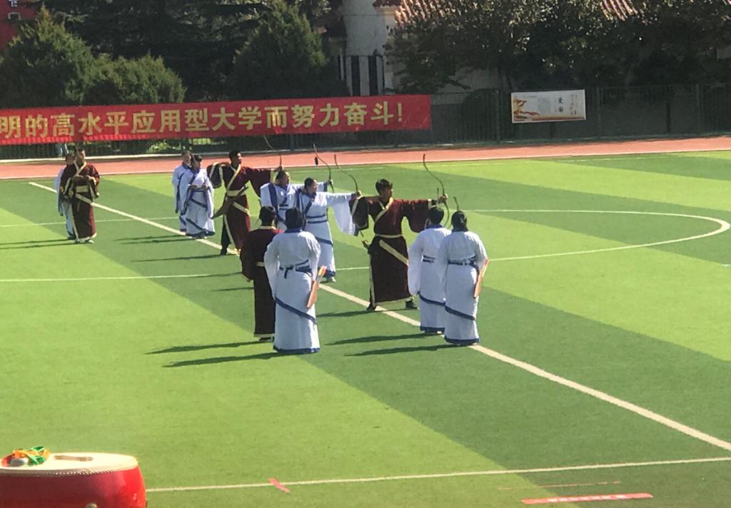 随即上场表演的是射箭队,队员们身穿华丽汉服,射箭技艺精湛,射箭过程仪态大方,从容典雅,充分演绎了力量美与准确美,让校友们深深感受到了射艺文化的独特魅力。
