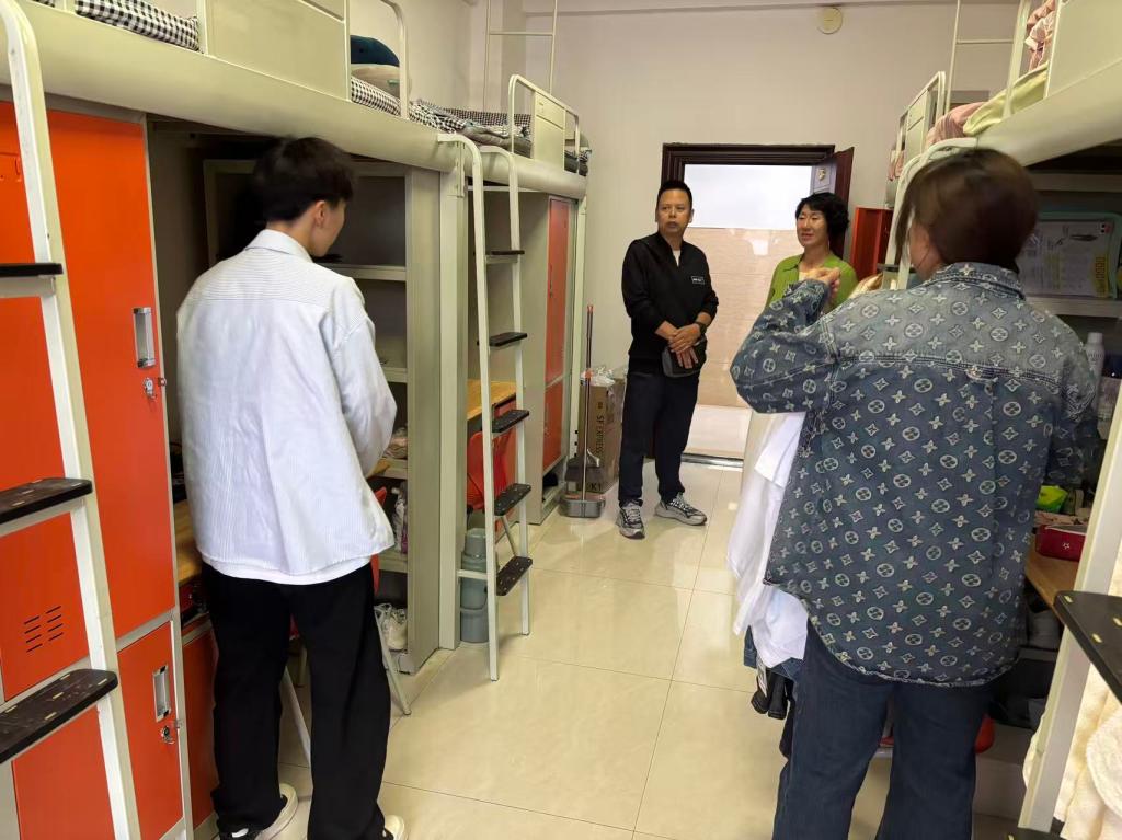 本次活动以“关怀新生,助力成长”为主题,慰问组一行分成两组,分别走访了新民公寓和明德公寓的新生宿舍。在明德公寓,慰问成员亲切询问新生的家乡、专业选择及报到情况。老师们与运动训练专业的学生交流专业发展规划,并结合自身经历建议新生:“体育不仅是技能,更是精神的锤炼,希望你们在未来的学习中,既能掌握专业知识,又能传承体育精神。”