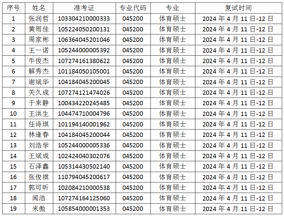 根据天水师范学院硕士研究生招生复试录取工作管理相关规定,经学院研究生招生工作领导小组会议审议,现将best365官网2024年体育硕士调剂复试考生名单进行公示,如有意见和问题,可在公示之日起七日内,向天水师范学院体育运动与健康学院办公室反映,联系电话:09388367713,具体名单如下: